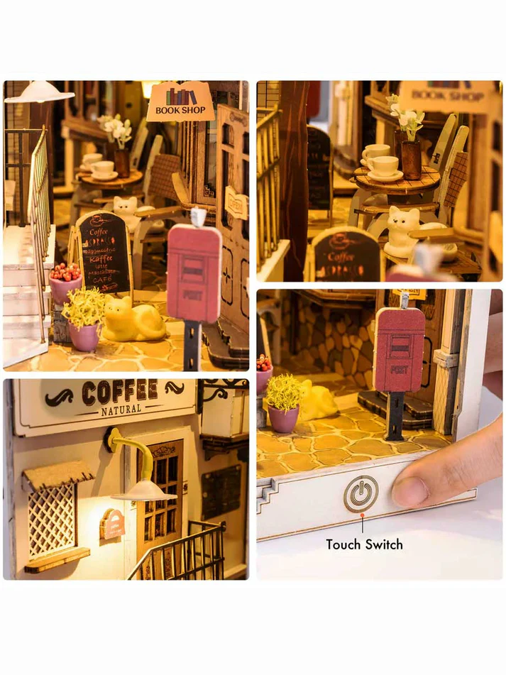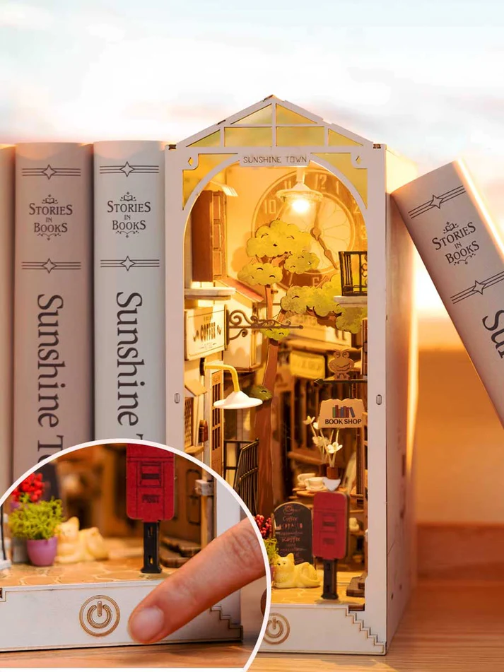 Discover the Robotime Rolife Sunshine Town DIY Book Nook (TGB02), a beautifully designed wooden puzzle that transforms your bookshelf into a cozy miniature town. This creative DIY dollhouse kit allows you to assemble a detailed Sunshine Town scene, complete with architectural elements, warm details, and a built-in LED light that brings the miniature to life.
